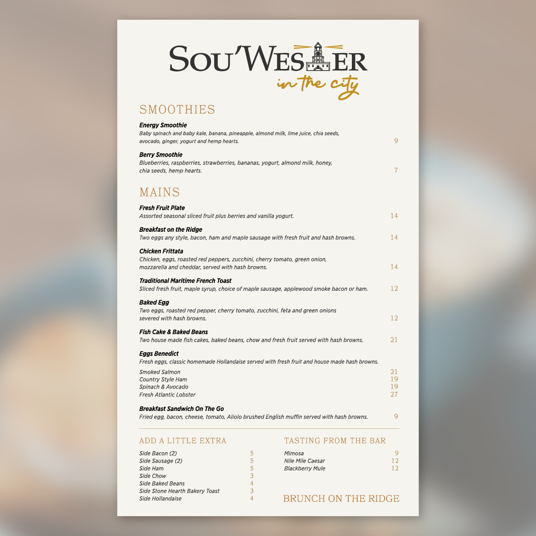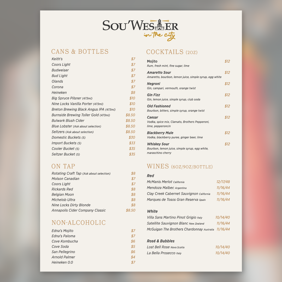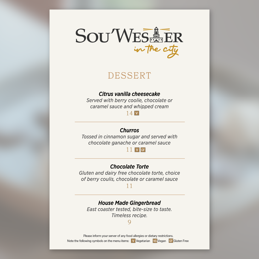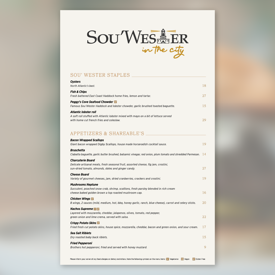 At Sou'wester In The City Restaurant & Social Menu, you'll find a delightful blend of coastal flavors and urban sophistication, all in the heart of Bedford. Nestled at 27 Dellridge Ln, this inviting spot offers an exciting menu that brings together fresh ingredients and creative dishes, perfect for any occasion. Whether you're in the mood for a casual bite or something more refined, there's something to satisfy every craving. Their carefully curated selections promise a variety of tastes, each crafted to bring a little taste of the sea to the city. From savory mains to delectable sides, the menu here is sure to offer a memorable dining experience that leaves you coming back for more.